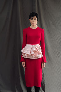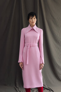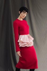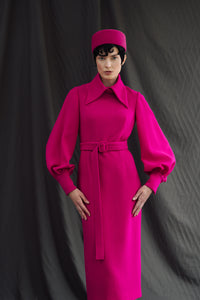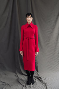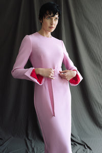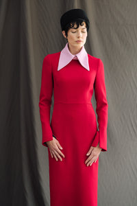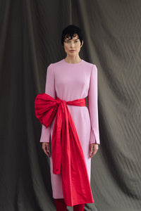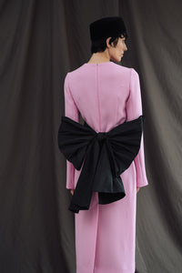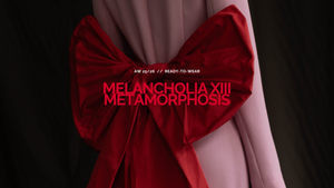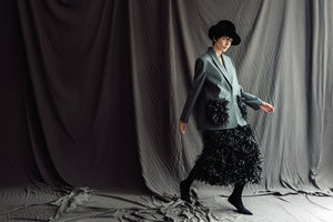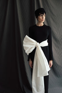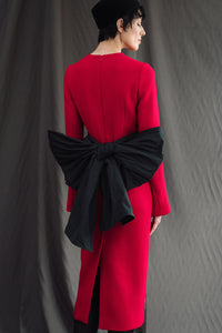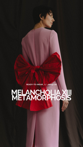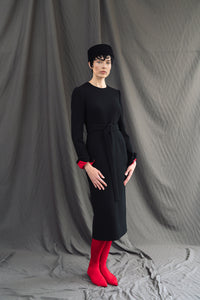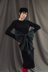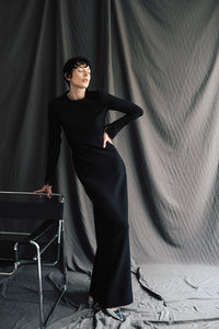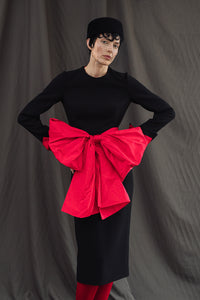 A floor-length gown in black wool, cut for a close fit with long sleeves finished by IV’s signature wrist slits. Minimal yet commanding, it is conceived as an all-occasion piece — a silhouette that can be refreshed and transformed with 3D rose brooches, silk taffeta bows, detachable collars, and other accents from the collection.