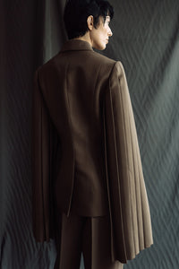 BROWN FITTED BLAZER WITH PLEATED OPEN SLEEVES