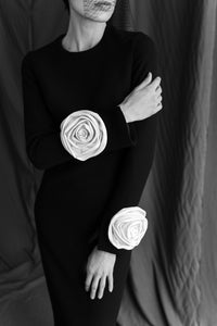 A handcrafted rose in sculptural silk taffeta, rendered in pure white. Fastened as a brooch, it adds a touch of ethereal romance — whether worn on a lapel, collar, or dress. A versatile accent designed to transform and refresh any silhouette.