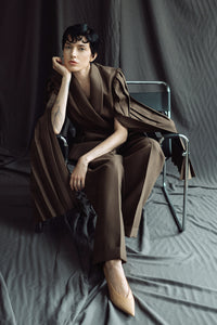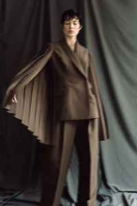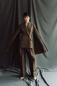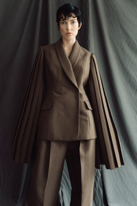 BROWN FITTED BLAZER WITH PLEATED OPEN SLEEVES