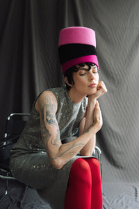 Wool, silk, and double crepe form the foundation, contrasted with tulle, organza, and taffeta to create texture and depth. A palette of timeless neutrals and greys is enriched by bold tones of red, fuchsia, and soft pink, accented by gemstone hues.