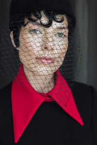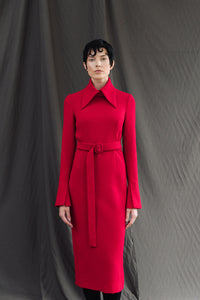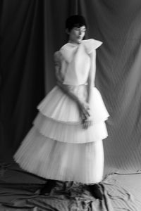 Wool, silk, and double crepe form the foundation, contrasted with tulle, organza, and taffeta to create texture and depth. A palette of timeless neutrals and greys is enriched by bold tones of red, fuchsia, and soft pink, accented by gemstone hues.
